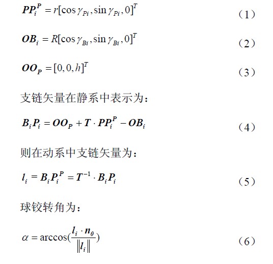 在動(dòng)平臺(tái)P1P2P3 上建立動(dòng)坐標(biāo)系OP-XPYPZP(圖 2),在靜平臺(tái)B1B2B3上建立靜坐標(biāo)系O-XYZ。靜平臺(tái) 半徑為R,動(dòng)平臺(tái)半徑為r,中央立柱的高度為h。轉(zhuǎn) 臺(tái)球鉸鏈數(shù)學(xué)模型可以通過支鏈BiPi在動(dòng)坐標(biāo)系中的 位置矢量BiPi P 來描述。BiPi P 與球鉸法線n0 的夾角即 為球鉸鏈的轉(zhuǎn)角α。 動(dòng)坐標(biāo)系OP-XPYPZP 到靜坐標(biāo)系O-XYZ 的旋轉(zhuǎn)矩陣為: