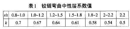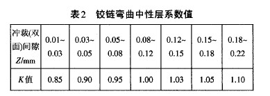 式中: △a——彎曲角回彈量;a ——彎曲件的彎曲角 度;r 彎曲件的彎曲半徑; r凸——彎曲凸模半徑。 從公式(2)可以看出,當 r一定時, △a受到a和r凸 的影響。a 越小,△a越大; a 越大,△a越小。而第1次 預彎工步的彎曲角△a已確定,且較小,只有26°,那么 只有減小r凸,以控制△a。而r 減小,勢必影響鉸鏈內孔圓度,從而影響鉸鏈質量。另外,同彈計算還 可按公式 :