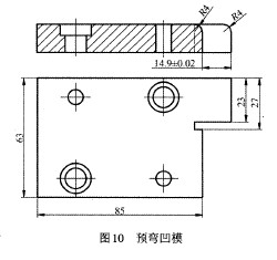 (2)預彎凹模設計??紤]到凹模剛性,2個工步 的預彎凹模設計成一個整體,如圖10所示。預彎凹 模是鑲于沖孔凹模上,關鍵尺寸是(14.9+0.02)mm, 它應同時保證2個工步預彎間隙。