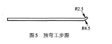 (2)預彎凸模3和預彎凸模4。預彎凸模3和預 彎凸模4設計時,圓角半徑 是關鍵,預彎凸模3的 圓角半徑,按2.5 mm設計;預彎凸模4的圓角半徑r 按2.55mm設計。其目的是保證內孔圓度。