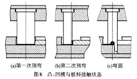 另外,應注意一點就是預彎凸模3、預彎凸模4 和彎圓凸模5在圖9的垂直方向大于被彎曲零件尺 寸,一般在結構空間允許的情況下,單向加大量取 0.5~ 2mm 。