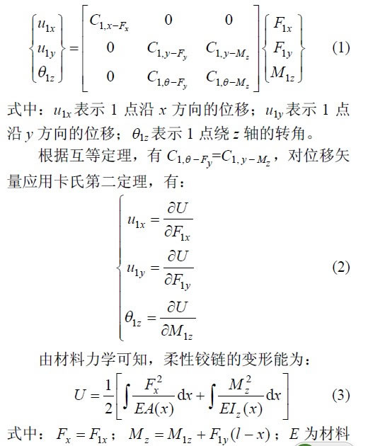 根據(jù)x-y 平面內(nèi)的運(yùn)動(dòng)特性,由卡式第二定理,可得柔性鉸鏈在1點(diǎn)的的變形量與載荷的關(guān)系為:
