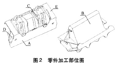 由于零件在各個方向都有型面,加工時要用專用銑夾將零件放置不同角度。用五坐標(biāo)立式機床加 工,再轉(zhuǎn)臥式機床加工兩端頭。因此靠夾具定位面設(shè)計不同角度來滿足數(shù)控加工。圖2所示為零件的加工部位。