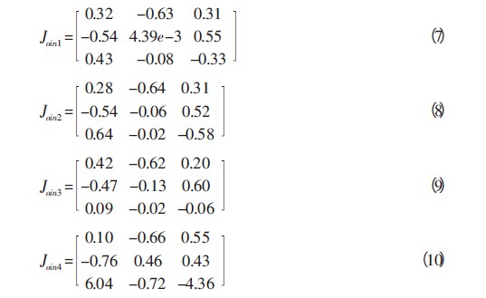 同理,根據(jù)雅可比矩陣的定義關(guān)系式,應(yīng)用軟件ANSYS獲得雅可比矩陣的過程為:(1)分別在載荷端施加單位位移(1);(2)測量動(dòng)平臺(tái)中心的位移,則可以得到相應(yīng)的雅可比矩陣的某一列元素,則可得出四種構(gòu)型的機(jī)構(gòu)的雅可比矩陣分別如下: