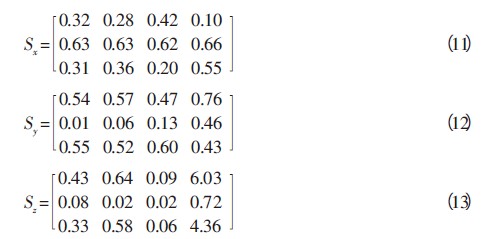 (2)測量輸出端的各個(gè)位移,則可以得到相應(yīng)的柔度矩陣的某一列元素,則可以得出四種不同柔性鉸鏈平臺(tái)的柔度矩陣分別如下: