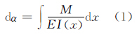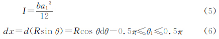 式中,α 是轉(zhuǎn)角;M 是轉(zhuǎn)矩;E 是材料彈性模量;I 是鉸鏈截面對(duì)z 軸的慣性矩。取出如圖2的微元進(jìn)行積分,可得鉸鏈轉(zhuǎn)角公式為: