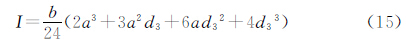 在加工柔性鉸鏈時(shí),切口圓弧軸心線的偏離情況較為復(fù)雜,主要有兩種情況,一種是兩圓弧的軸心線互相平行,具有共同的垂直度誤差φ,在具體的微位移機(jī)構(gòu)中,這會(huì)導(dǎo)致不對(duì)稱的應(yīng)力狀態(tài),可能引入機(jī)構(gòu)位移耦合誤差。第二種是兩圓弧軸心線不平行,從而導(dǎo)致鉸鏈截面發(fā)生變化。我們考慮第二種情況,當(dāng)軸心線左右偏離時(shí)所得截面和上文1.2節(jié)所述類似,而當(dāng)其中一條軸心線前后偏離時(shí)的誤差d3如圖5所示,取出圖5中間鉸鏈截面,如圖6所示。