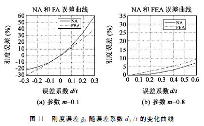 鉸鏈參數(shù)m 對(duì)剛度誤差β3也不敏感,但誤差參數(shù)d3/t的影響較大,如圖11所示,?。恚剑埃?,當(dāng)d3/t=0.3時(shí),NA 的誤差是59.11%,FEA 的誤差是41.44%;當(dāng)d3/t= -0.3 時(shí),NA 的誤差是-21.53%,FEA的誤差是-27.63%。同時(shí)注意到,在數(shù)值計(jì)算時(shí),假設(shè)圖6所示鉸鏈截面兩端的轉(zhuǎn)角是一致的,而實(shí)際上當(dāng)施加一定載荷時(shí),截面兩端的轉(zhuǎn)角并不一致而具有一定的扭轉(zhuǎn),這也造成了NA 和FEA計(jì)算結(jié)果的偏差。