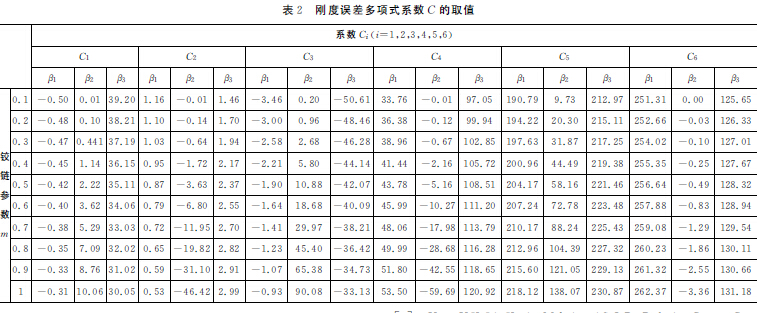 合式(8)可求得剛度誤差β2。對(duì)p=(0,0.3)范圍內(nèi)的誤差β2進(jìn)行數(shù)值積分和多項(xiàng)式擬合,得到鉸鏈不同m 參數(shù)下誤差系數(shù)p 造成的剛度誤差為