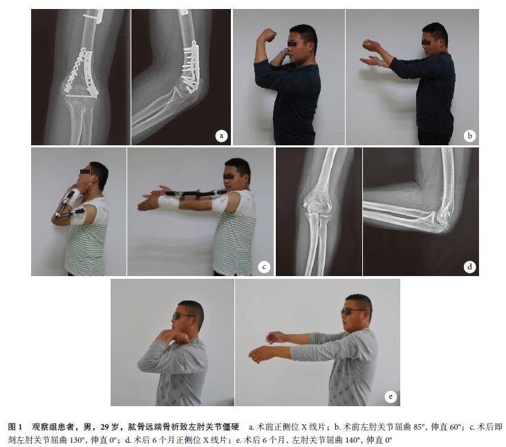 1.3.1 觀察組 根據(jù)術(shù)前常規(guī)CT及X線片檢查結(jié)果進(jìn)行手術(shù)評(píng)估,選擇合適的入路方式,包括肘關(guān)節(jié)內(nèi)外側(cè)聯(lián)合入路(19例),完全暴露肘關(guān)節(jié),進(jìn)行徹底松解;后側(cè)入路(8例),對(duì)肘關(guān)節(jié)內(nèi)外及后方結(jié)構(gòu)進(jìn)行松解;內(nèi)側(cè)入路(11例),松解關(guān)節(jié)囊及橈骨附近結(jié)構(gòu)?;颊哂谌椋?例)或局麻(32例)下,采用Kocher切口完成關(guān)節(jié)松解。清除肘關(guān)節(jié)病變部位、萎縮的關(guān)節(jié)囊及周圍增生骨贅;每松解一個(gè)部位后,修復(fù)肘關(guān)節(jié)副韌帶,緩慢均勻屈伸患肢,逐步增加患肢肘關(guān)節(jié)活動(dòng)度,當(dāng)達(dá)到理想屈伸活動(dòng)度后,進(jìn)行鉸鏈?zhǔn)酵夤潭ㄖЪ芄潭?。C臂X線機(jī)對(duì)患肢肘關(guān)節(jié)進(jìn)行透視,以肘關(guān)節(jié)旋轉(zhuǎn)中心作為鉸鏈?zhǔn)酵夤潭ㄖЪ艿闹行奈稽c(diǎn),在橈骨遠(yuǎn)端及肱骨側(cè)打入2枚固定針,加固外固定支架。確認(rèn)患肢活動(dòng)無(wú)障礙后,對(duì)肘關(guān)節(jié)處進(jìn)行消炎殺菌處理。